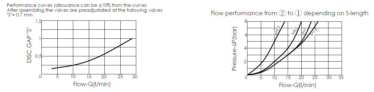 The valve is only supposed to be operated in case of hose failure. In the event of a hose failure, flow increases across the valve until the maximum safe limit is reached, at which point the valve will close. The “S” gap must be adjusted to allow a flow at least 50% above the nominal regulated flow from the actuator. These valves can be supplied (on request) with an orifice on the disc, allowing for emergency lowering of the load. It is recommended to fit a flow regulator valve downstream of the hose burst valve, at the end of the flexible hose, to control the lowering speed to the nominal value.