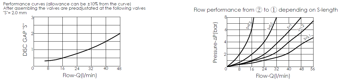 The valve is only supposed to be operated in case of hose failure. In the event of a hose failure, flow increases across the valve until the maximum safe limit is reached, at which point the valve will close. The “S” gap must be adjusted to allow a flow at least 50% above the nominal regulated flow from the actuator. These valves can be supplied (on request) with an orifice on the disc, allowing for emergency lowering of the load. It is recommended to fit a flow regulator valve downstream of the hose burst valve, at the end of the flexible hose, to control the lowering speed to the nominal value.