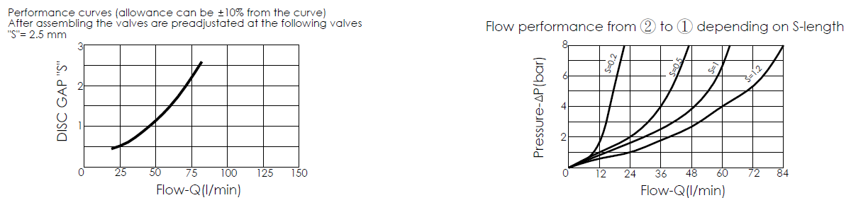 The valve is only supposed to be operated in case of hose failure. In the event of a hose failure, flow increases across the valve until the maximum safe limit is reached, at which point the valve will close. The “S” gap must be adjusted to allow a flow at least 50% above the nominal regulated flow from the actuator. These valves can be supplied (on request) with an orifice on the disc, allowing for emergency lowering of the load. It is recommended to fit a flow regulator valve downstream of the hose burst valve, at the end of the flexible hose, to control the lowering speed to the nominal value.