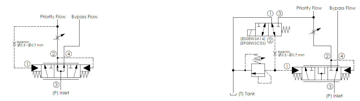 This is a spool-type, bypass/restrictive modulating logic element valve with an external orifice to provide bypass/restrictive flow control. Input flow at port 3 is directed to the priority or control flow at port 2. Once priority flow requirements are met, excess flow is bypassed to port 4. The after-orifice signal at port 1 and before-orifice design (see application example) maintain constant pressure and flow on the priority side of the circuit, regardless of pressure in the bypass circuit.
