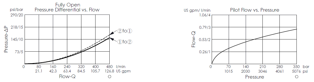 We recommend using a pilot pressure above 30 bar (450 psi) at port 3 when ports 1 and 2 are at 350 bar (5000 psi). This ensures quick shifting across various pressure and flow conditions.