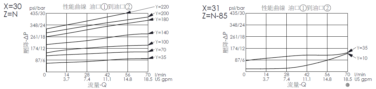 X=30 為無內部節流孔設計,可作為旁通補償器或切換元件使用。當口1壓力超過彈簧壓力,滑軸將移動以允許口1流向口2。口3的導壓力以1:1的比例直接增加到閥件設定。精度高。