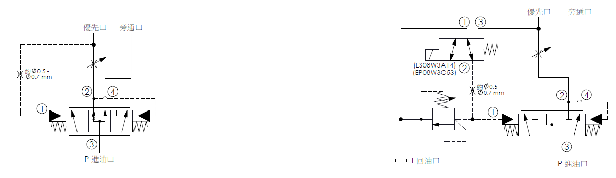 此閥為滑軸結構、旁通/節流、調節邏輯閥,連接外部孔口以旁通/限制流量控制。口3的輸入流量被導向口2的優先或控制流量。一旦滿足優先流量,多餘的流量將旁通至口4。無論旁路迴路中的壓力如何,口1的孔後訊號和孔前設計(參考應用迴路)都可以在迴路的優先側保持恆定的壓力和流量。