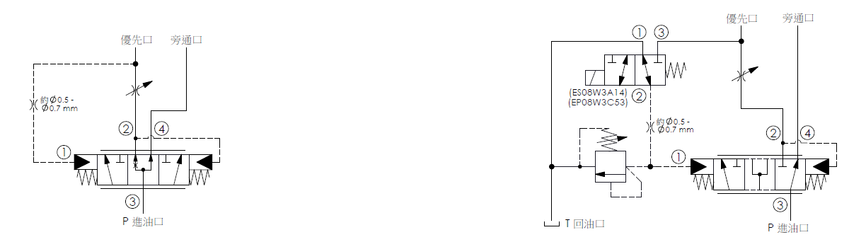此閥為滑軸結構、旁通/節流、調節邏輯閥,連接外部孔口以旁通/限制流量控制。口3的輸入流量被導向口2的優先或控制流量。一旦滿足優先流量,多餘的流量將旁通至口4。無論旁路迴路中的壓力如何,口1的孔後訊號和孔前設計(參考應用迴路)都可以在迴路的優先側保持恆定的壓力和流量。