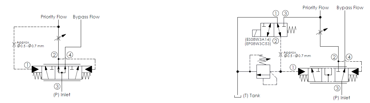 This is a spool-type, bypass/restrictive modulating logic element valve with an external orifice to provide bypass/restrictive flow control. Input flow at port 3 is directed to the priority or control flow at port 2. Once priority flow requirements are met, excess flow is bypassed to port 4. The after-orifice signal at port 1 and before-orifice design (see application example) maintain constant pressure and flow on the priority side of the circuit, regardless of pressure in the bypass circuit.